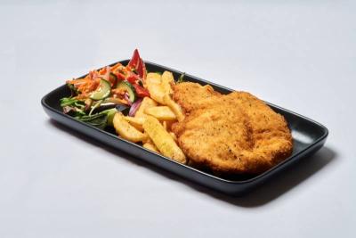 Turkish bun, chicken schnitzel, lettuce, american cheese, tomato, onion, aioli. Served with Chips.Upgrades