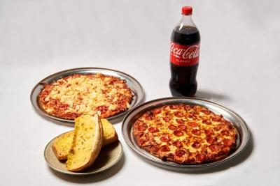 Double Trouble (Family)$55.95Any 2 Pizzas, Garlic Bread, Any 1.25L Drink- The No Brainer (Large)$42.95Any 2 Pizzas, Large Chips, Garlic Bread, 1.25L Drink