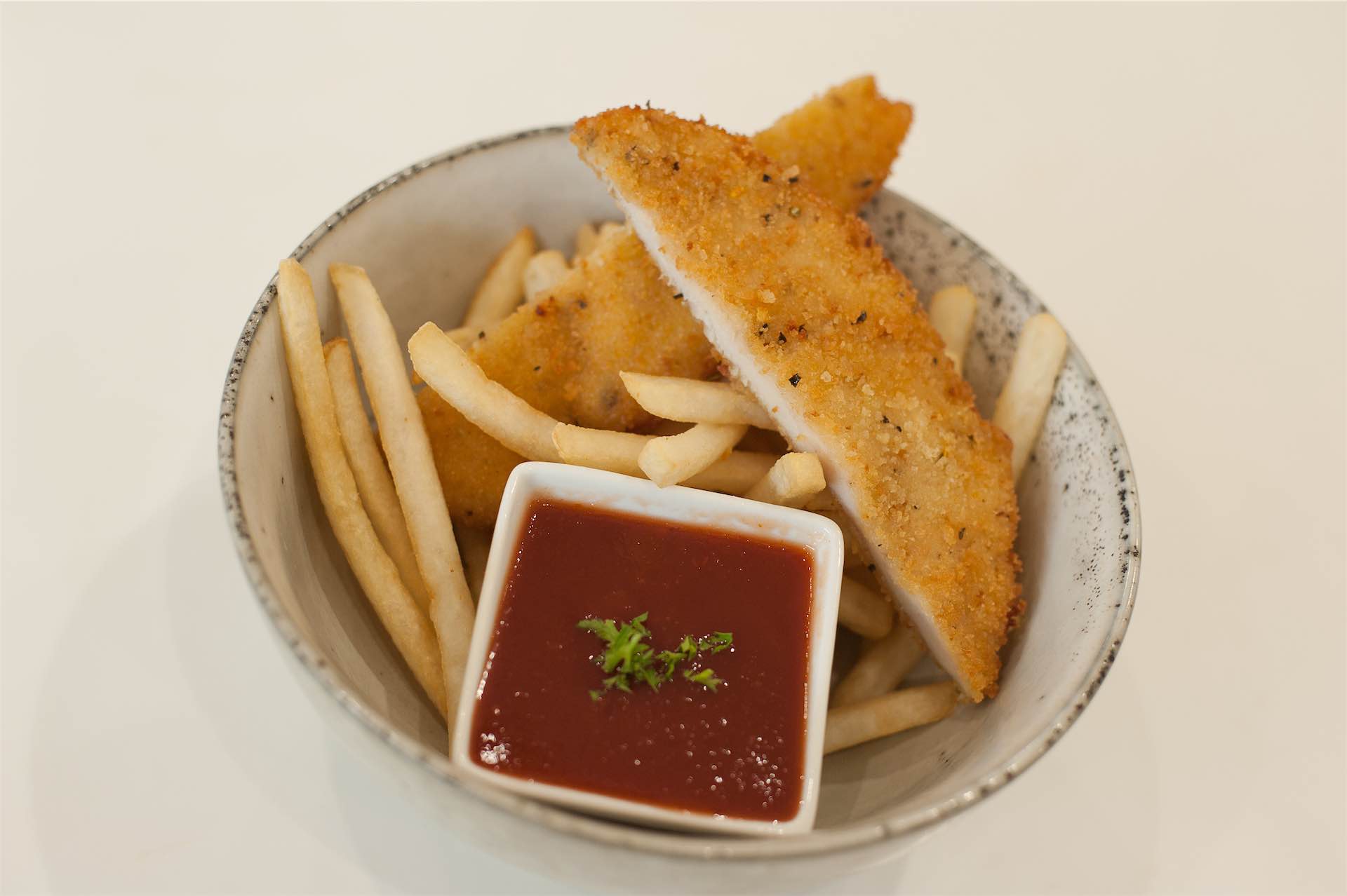 Crumbed Chicken, Lettuce and Cheese served with Fries and a Pop Top.Bambino Sauce