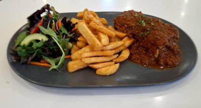 Turkish bun, chicken schnitzel, American Cheese, caramalised Chilli Onions, Fried Jalapeños, Lettuce, sriracha Sauce Served with ChipsUpgrades