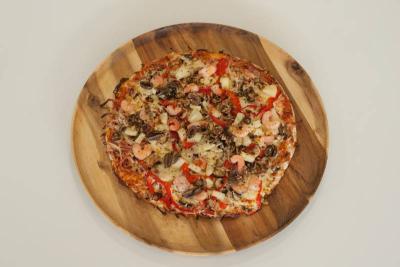 Tomato Base, Salami, Ham, Cheese, Onion, Capsicum, Mushroom, Pineapple, Prawns, Olives, Oregano & Garlic. (GFO)